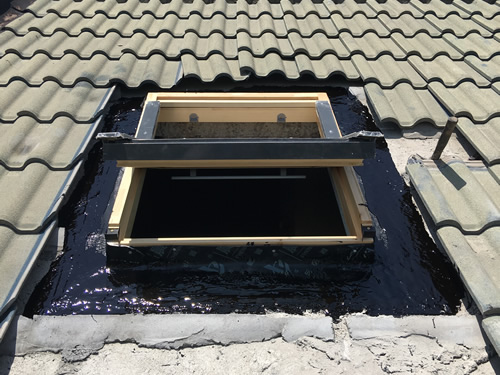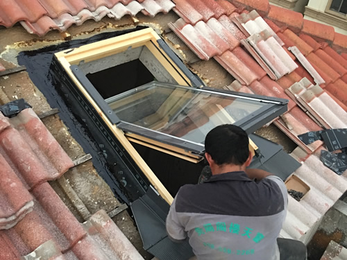 清理洞口安装固定,把固定件钉在窗上,天窗装在屋面防水层上,天窗外面要高于瓦1-3厘米(固定件调节)