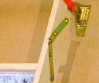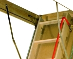 当阁楼梯木板门打开时,两侧的弹簧也随之拉下,一个通往阁楼的更加宽阔舒服的通道展现眼前(这是目前市场上宽的一种阁楼梯入口)